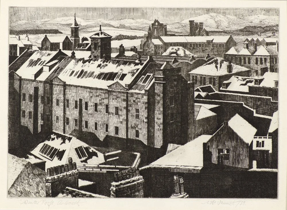 W.P.Vannet, Winter Roofs, Arbroath, etching, 15 x 21.5cm, 1939