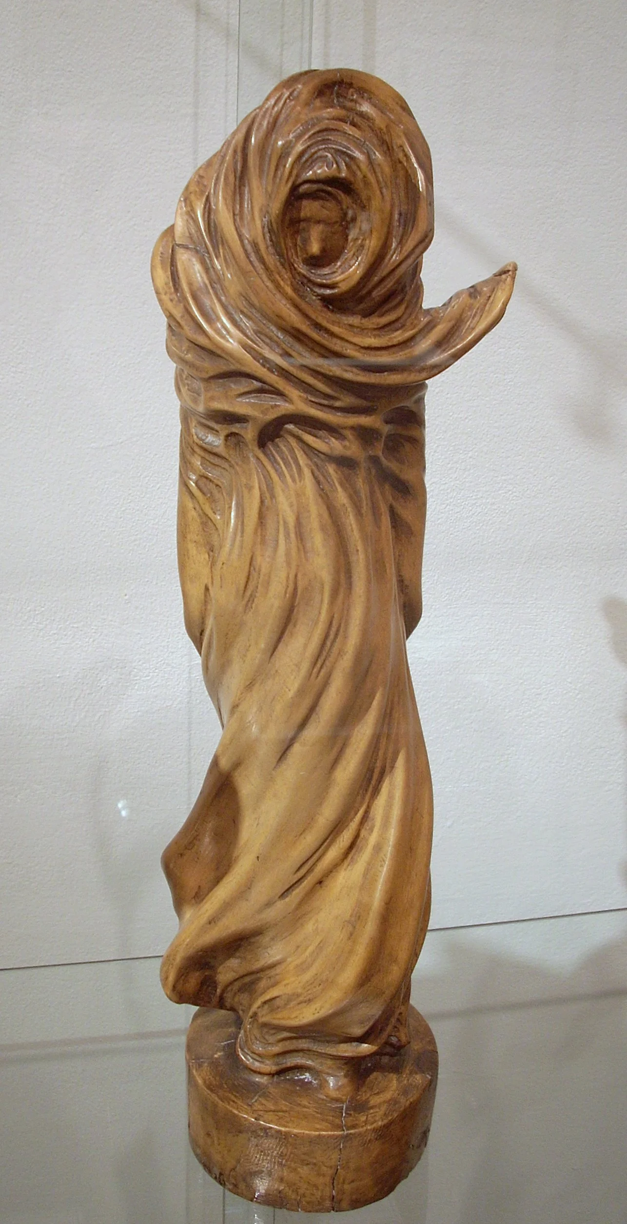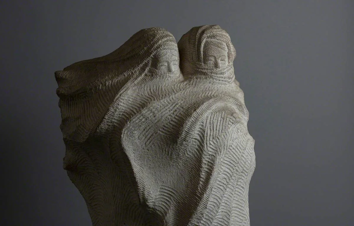 To embrace this new material, this classically-trained sculptor changed his style completely: the muscular limbs and facial features of his representational art dissolve into a sequence of almost abstract figures enveloped in swirling draperies, which twist, writhe and cling around their etiolated bodies, their bending, swaying forms seeming to echo the organic growth of the timber itself. Somewhere in the background there may be a memory of the caryatids and winged victories of ancient Greece but more immediately Lamb is back in Ferryden, with his steadfast fishwives (they’re almost all women) bracing themselves against the bitter wind off the North Sea. The Whisper, which many Montrosians would probably choose as their favourite William Lamb artwork, also belongs to this time. This is carved in Hopton Wood stone, a pale, fine-grained stone from Derbyshire, though the chip-carving technique echoes that of woodwork. It portrays two women muffled in shawls, heads together as if exchanging delicious and conspiratorial confidences.